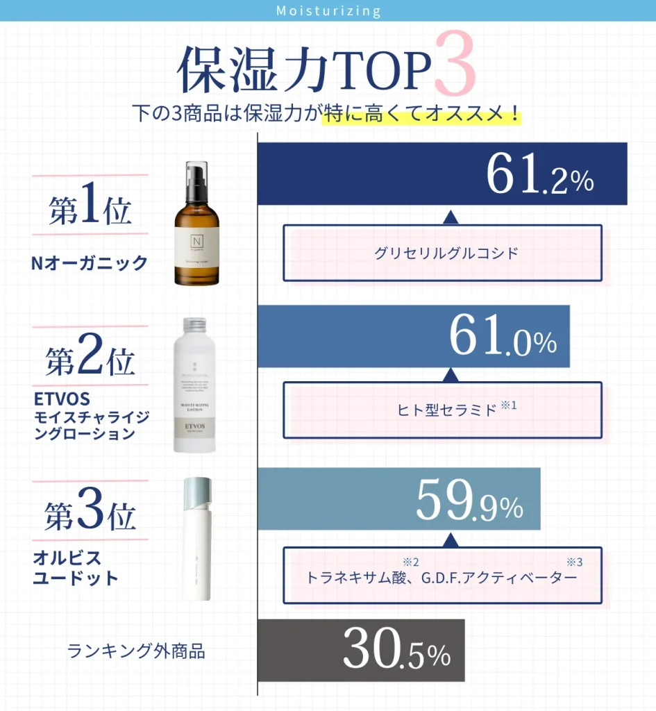 今回ご紹介している化粧水の中でも1位のNオーガニックは最も保湿力の高い結果となっているのでおすすめです。