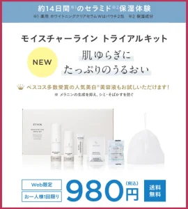 ETVOSのモイスチャーラインが約14日間たっぷり試せるトライアルセットがおひとり様1回限り、web限定で980円(税込)でゲットできちゃいます!
