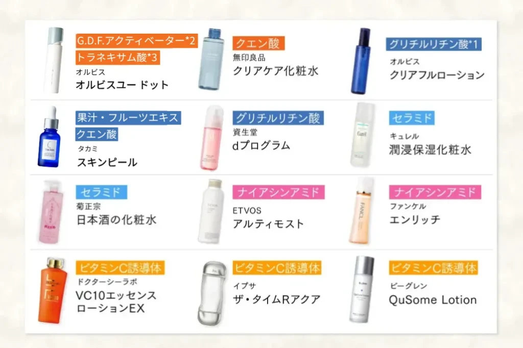 解決したい毛穴タイプごとに使うべき「成分」と「おすすめの化粧水/美容液」を下にまとめてみました!