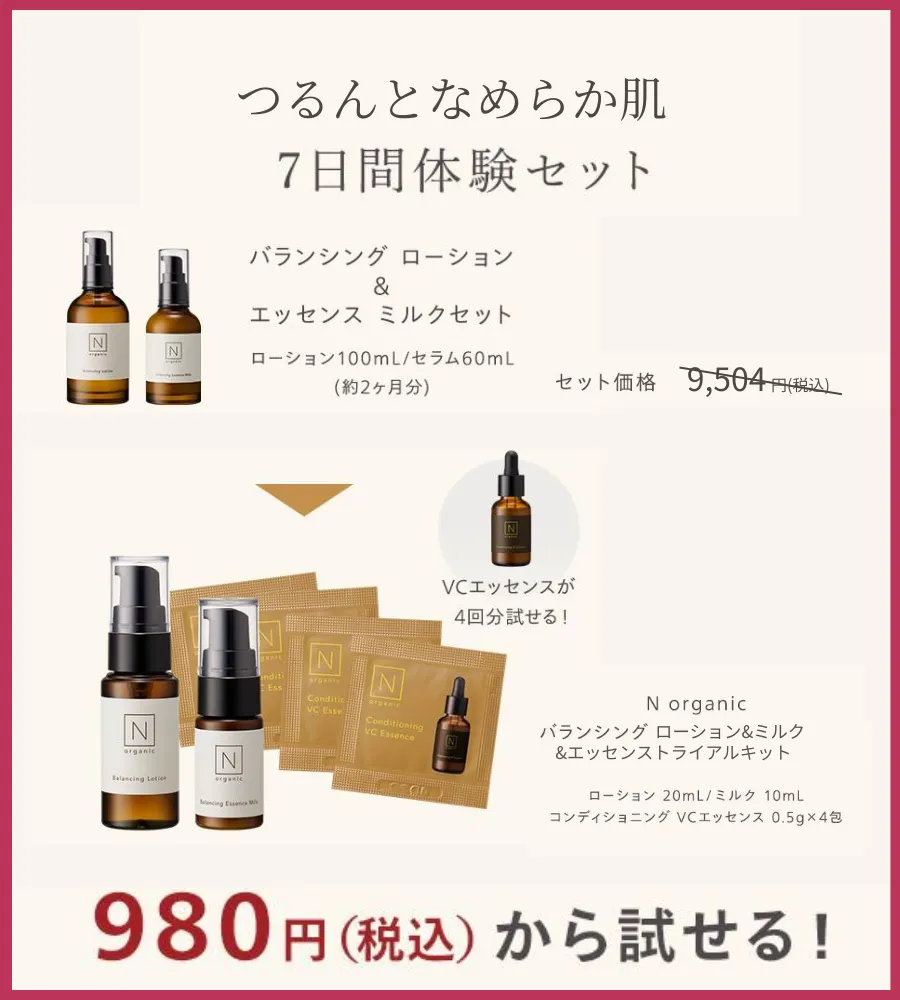 化粧水&乳液7日分に加えて美容液が4回分試せるトライアルキットがキャンペーン特別価格980円。