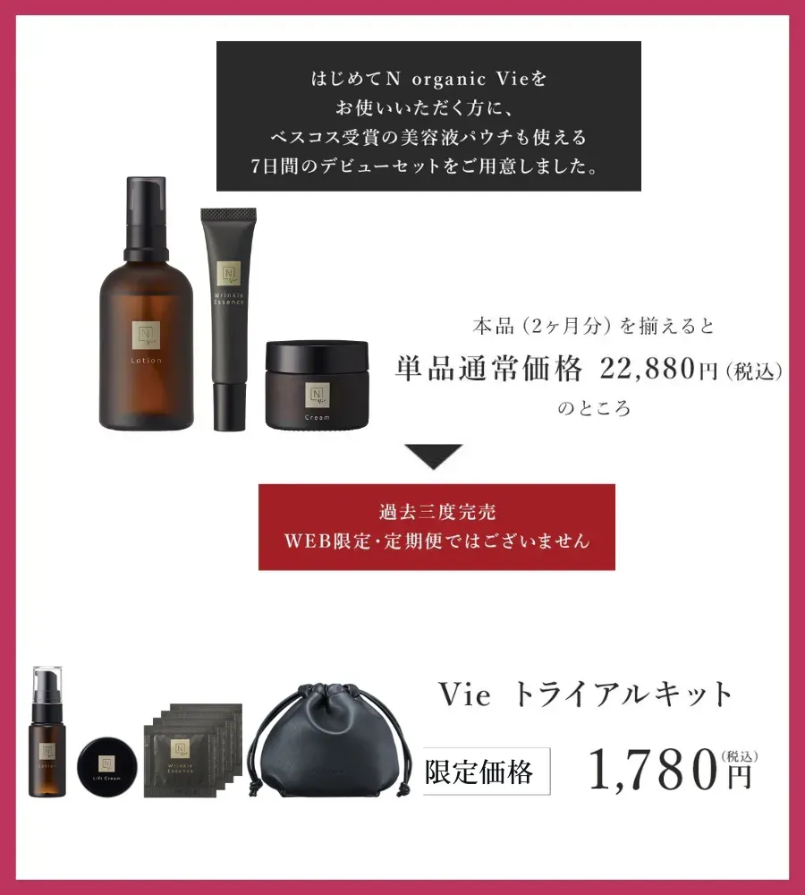 Vieシリーズの化粧水、美容液、クリームを揃えようと思うと単品通常価格は22,830円(税込)になるのでかなりお得ですよね…!